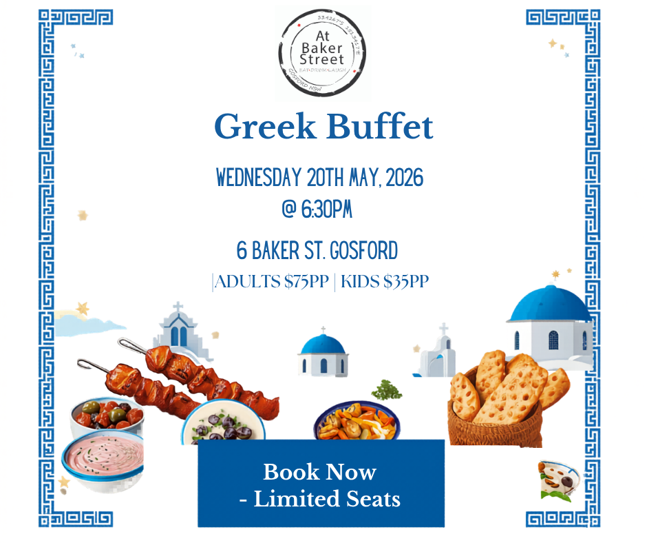 Greek Feast Buffet Wednesday 20th May 2026 – 6:30pm